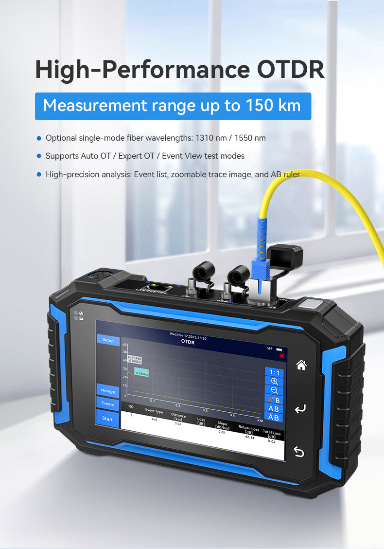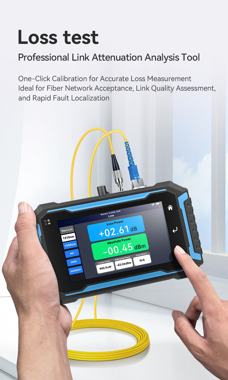 • Loss Test Mode (OTDR & power/meter combined): Offers flexibility for various fiber testing scenarios with support for two key wavelengths.