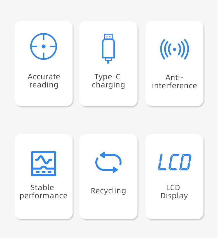 Accurate Reading. Type-C Charging. Anti-Interference. Stable Performance. Recycling. LCD Display.