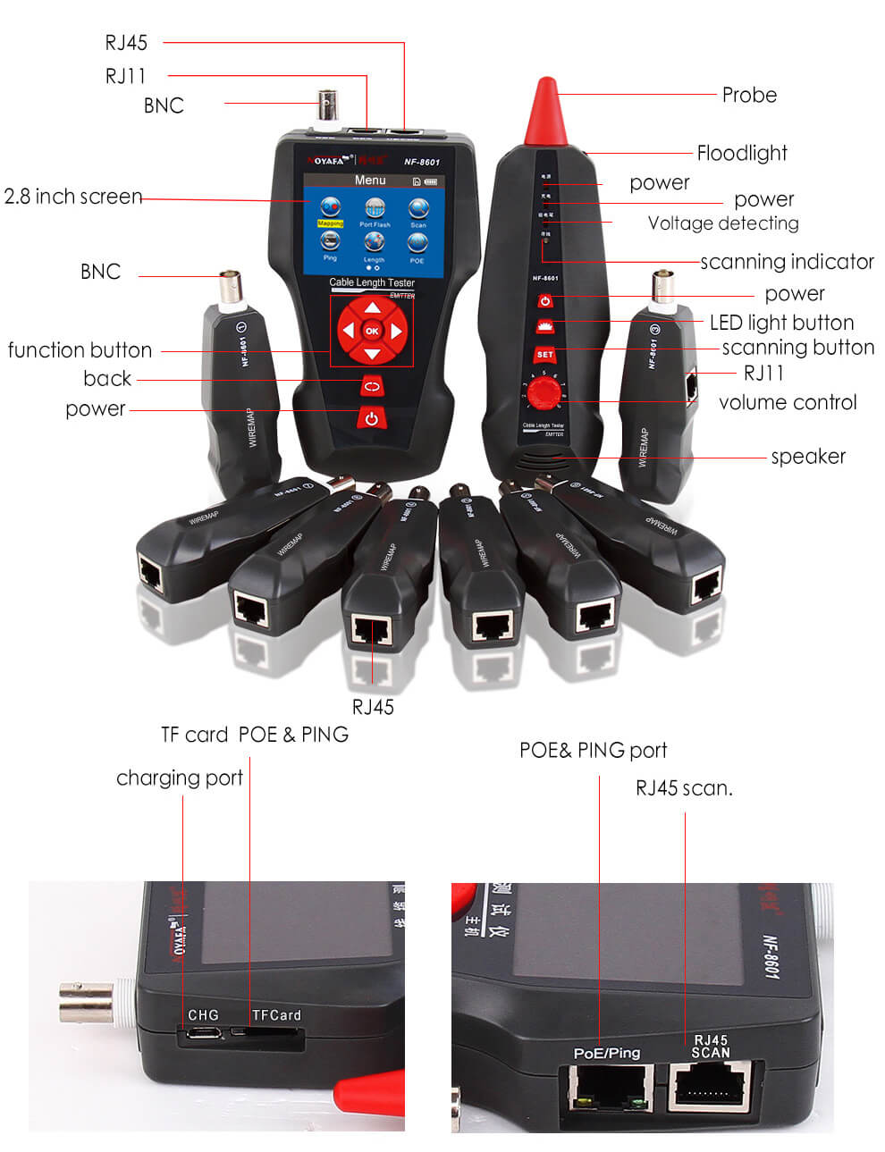 Quickly understand NF-8601W cable tester through the device buttons and feature diagrams.