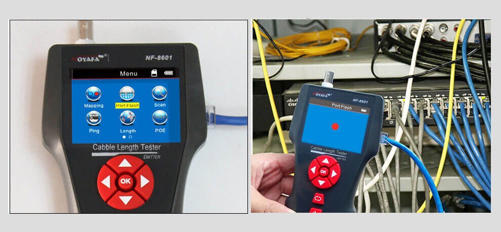 Put one side of the cable into PoE & PING ports, the other connects to the switch. Choose the "Port Flash" and enter the function. You can see a red circle from the screen and it will flash the same frequency as the LED lights on the switch, than means this is the target cable.