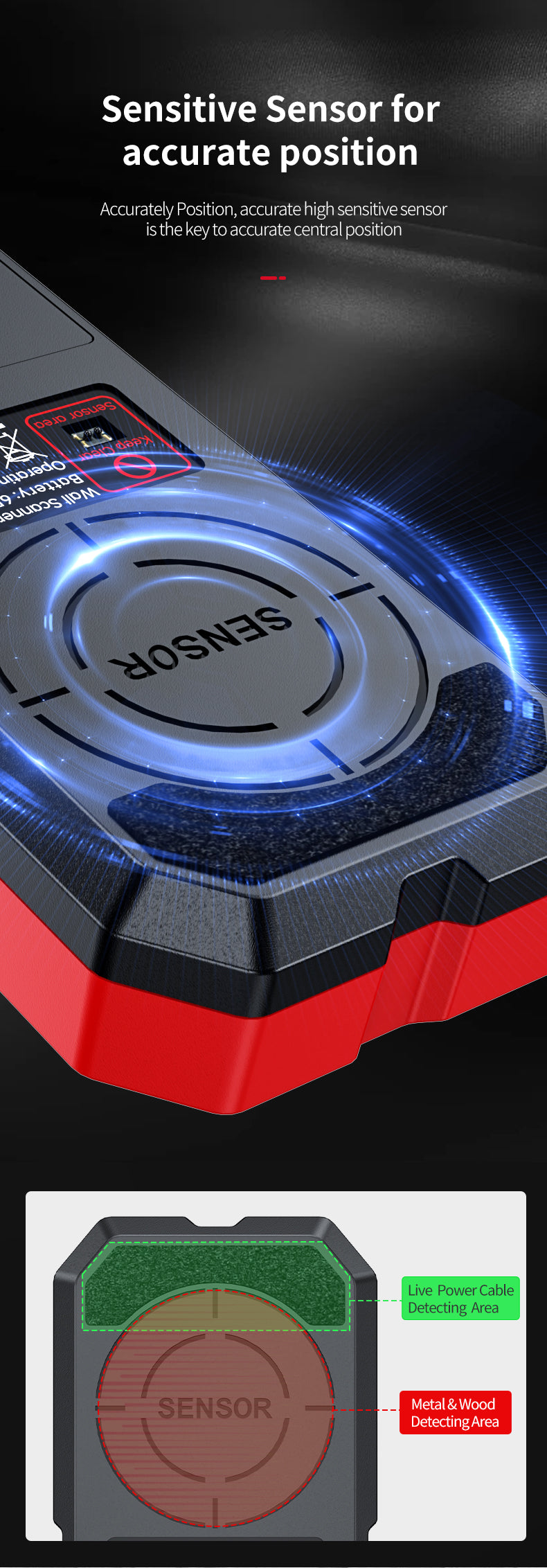 Better display for the detecting process and result, accurately locate the position for metal, wood, and live ac power cable in the wall/ ceiling/ floor