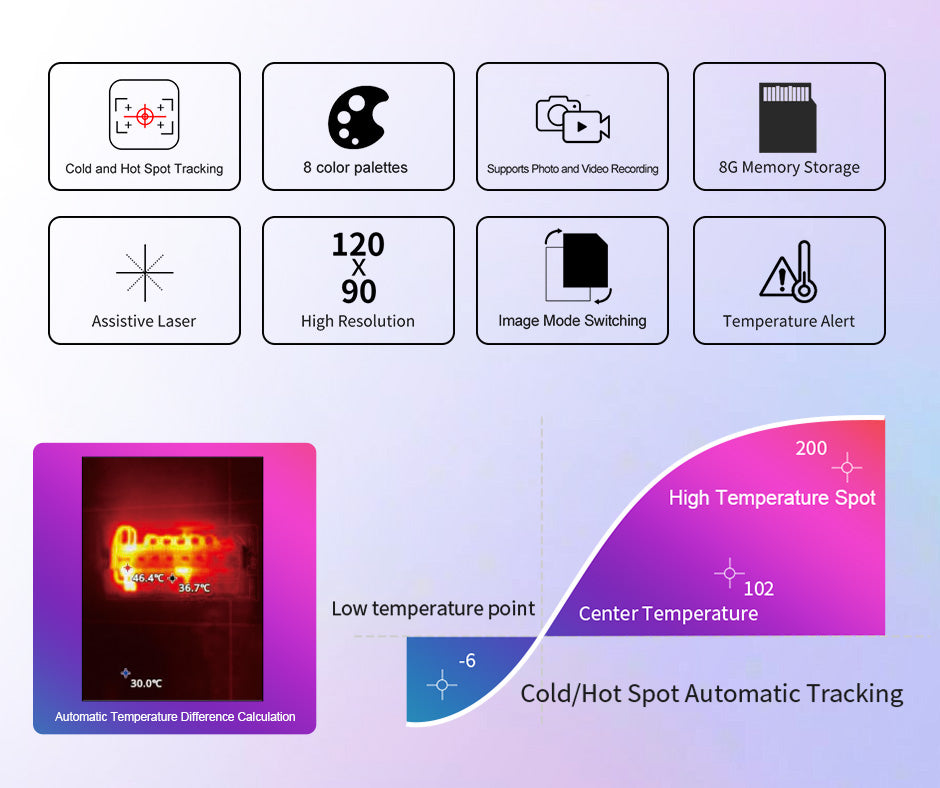 Up to 19200 temperature measuring points, presenting clear infrared images with 120*90px infrared resolution