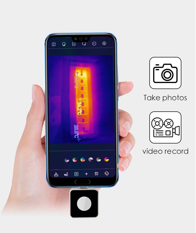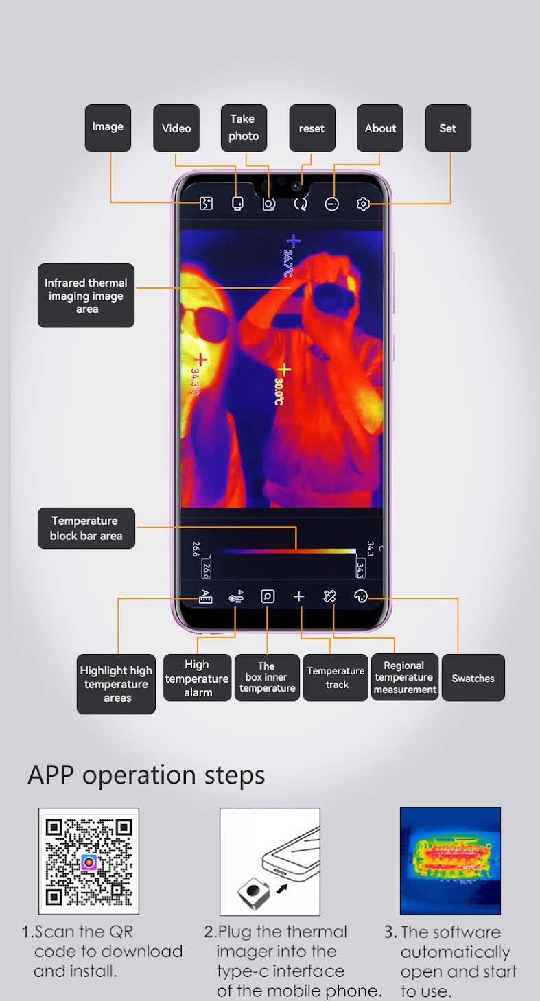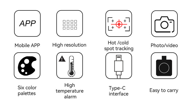Εφαρμογή για κινητά. Υψηλή ανάλυση. Hot / Cold Spot Tracking. Τηλέφωνο / βίντεο. Έξι παλέτες χρωμάτων. Συναγερμός υψηλής θερμοκρασίας. Διεπαφή τύπου C. Εύκολο στη μεταφορά.