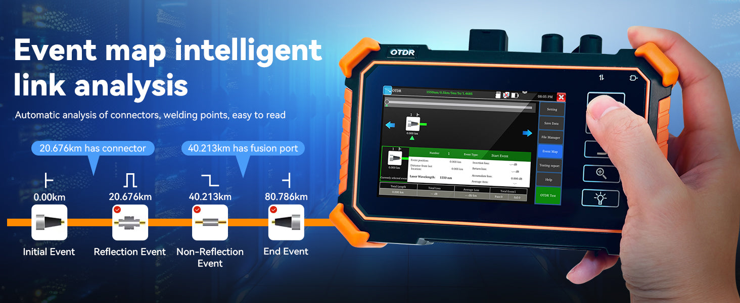 Auto OTDR Test: Automatically sets pulse width and measurement duration, reducing testing time to 5 seconds.