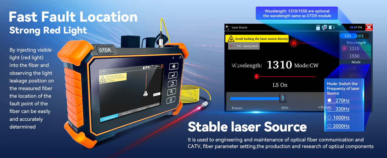Visible Fault Locator (VFL): Easily locates fiber faults with strong red light for quick and accurate identification.