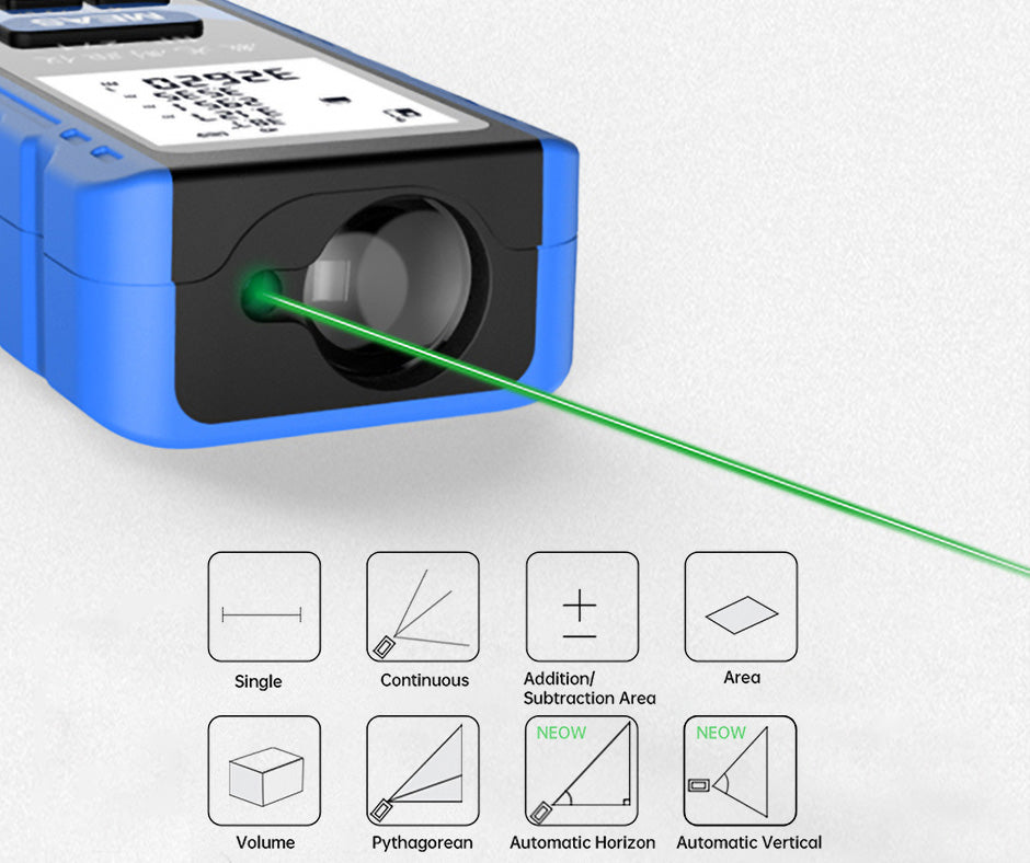 • 여러 측정 모드 - 단일, 연속, 추가/뺄셈, 면적, 볼륨, 피타고라스, 자동 수평 및 자동 수직, 일상적인 작업 요구를 포함한 다양한 측정 모드를 지원합니다.