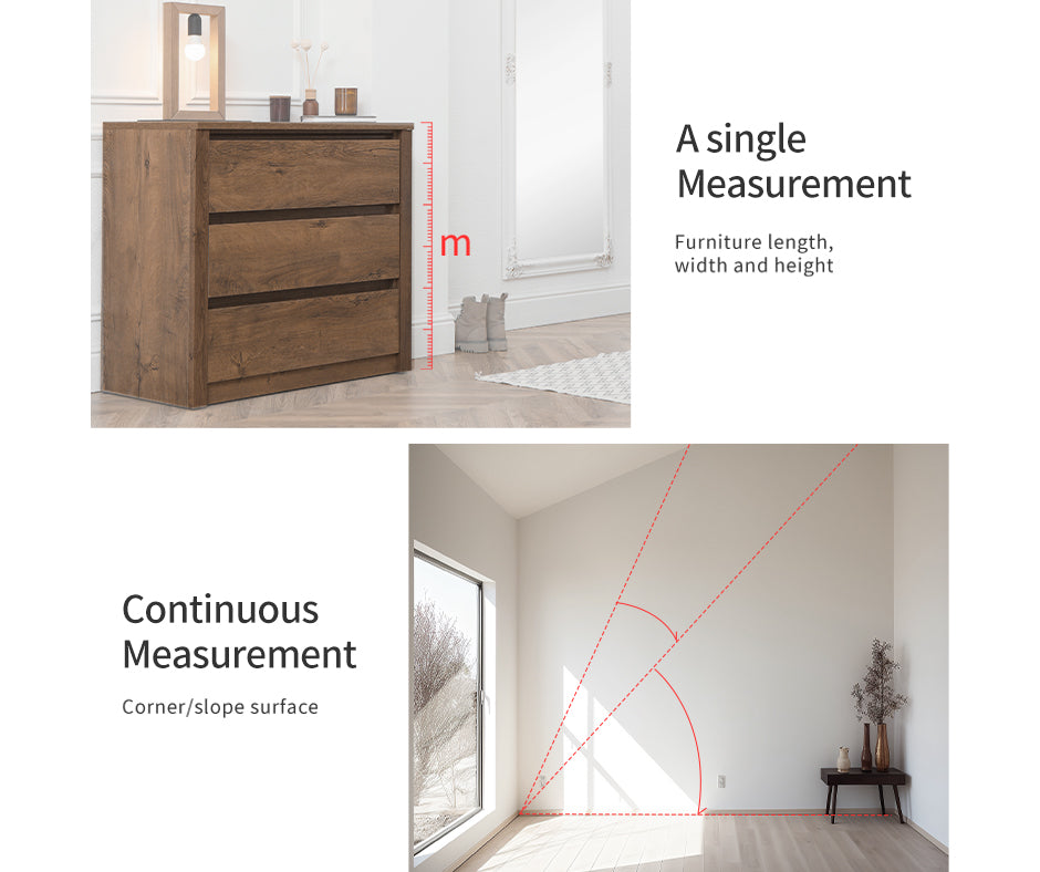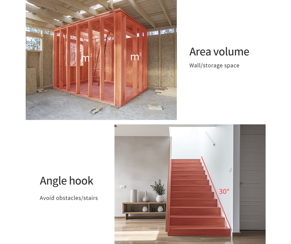 • 11-in-1 측정 ​​장치 - 단일 측정, 연속 측정, 면적 측정, 부피 측정, 각도 및 높이 측정, 최대/최소 측정, 전후 기준 및 후크 측정 등 다양한 측정 요구를 충족하기위한 11 가지 기능이 장착되어 있습니다.
