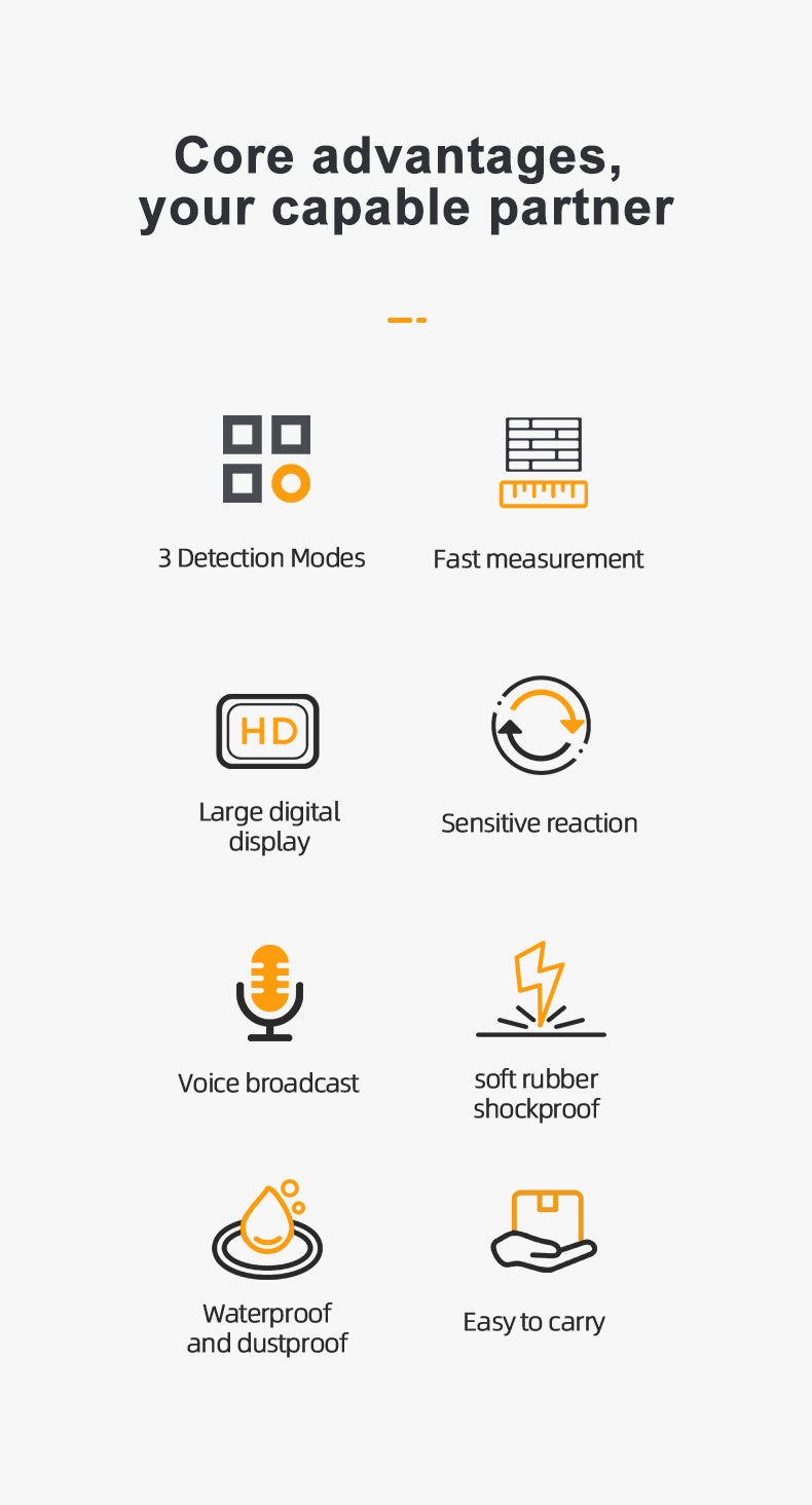 • 세 가지 탐지 모드: 금속, 목재 및 라이브 와이어를 감지 할 수 있습니다. 이 광범위한 탐지 기능을 통해 다양한 구성 및 유지 보수 작업에 적합하여 사용자가 드릴링하기 전에 다양한 자료를 식별 할 수있어 숨겨진 물체를 손상시킬 위험이 줄어 듭니다.
