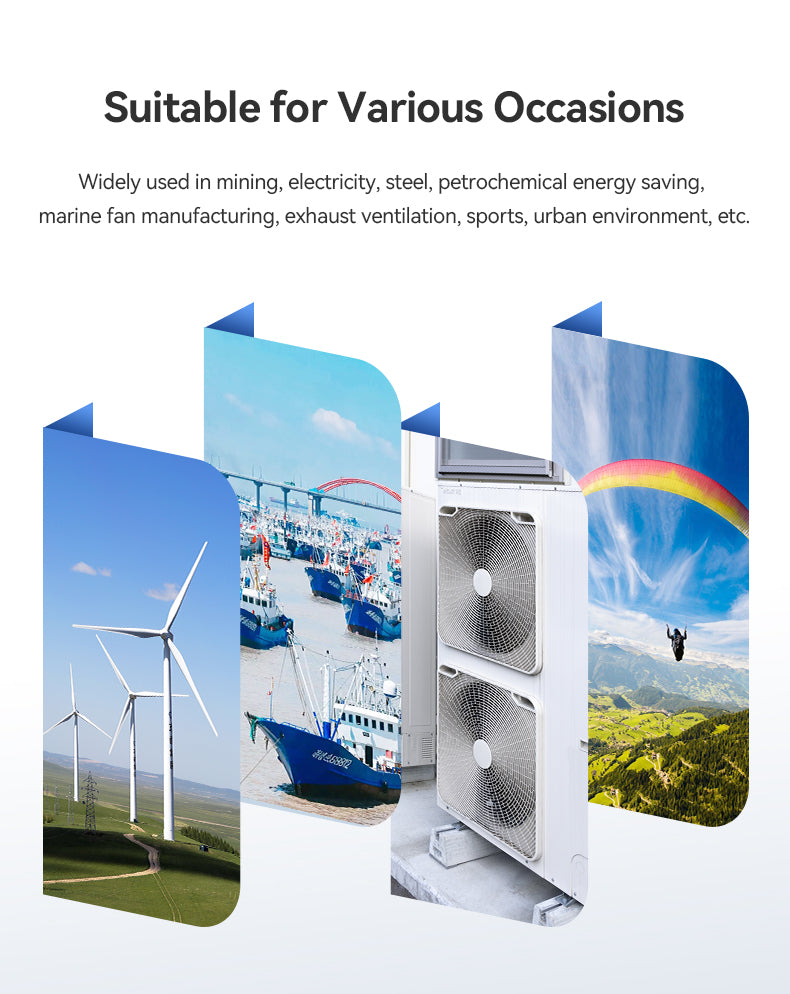 Widely used in mining, electricity, steel, petrochemical energy saving, marine fan manufacturing, exhaust ventilation, sports, urban environment, etc.