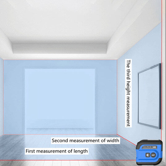 To test the volume of a room, boot the laser tape measure to Volume mode. Measure the height, length, and width. It will do the rest.